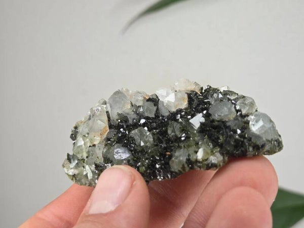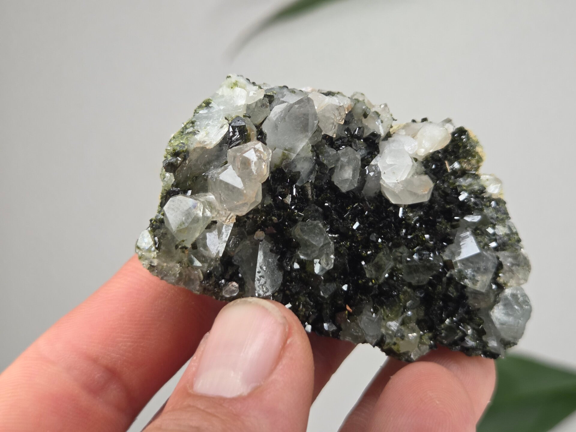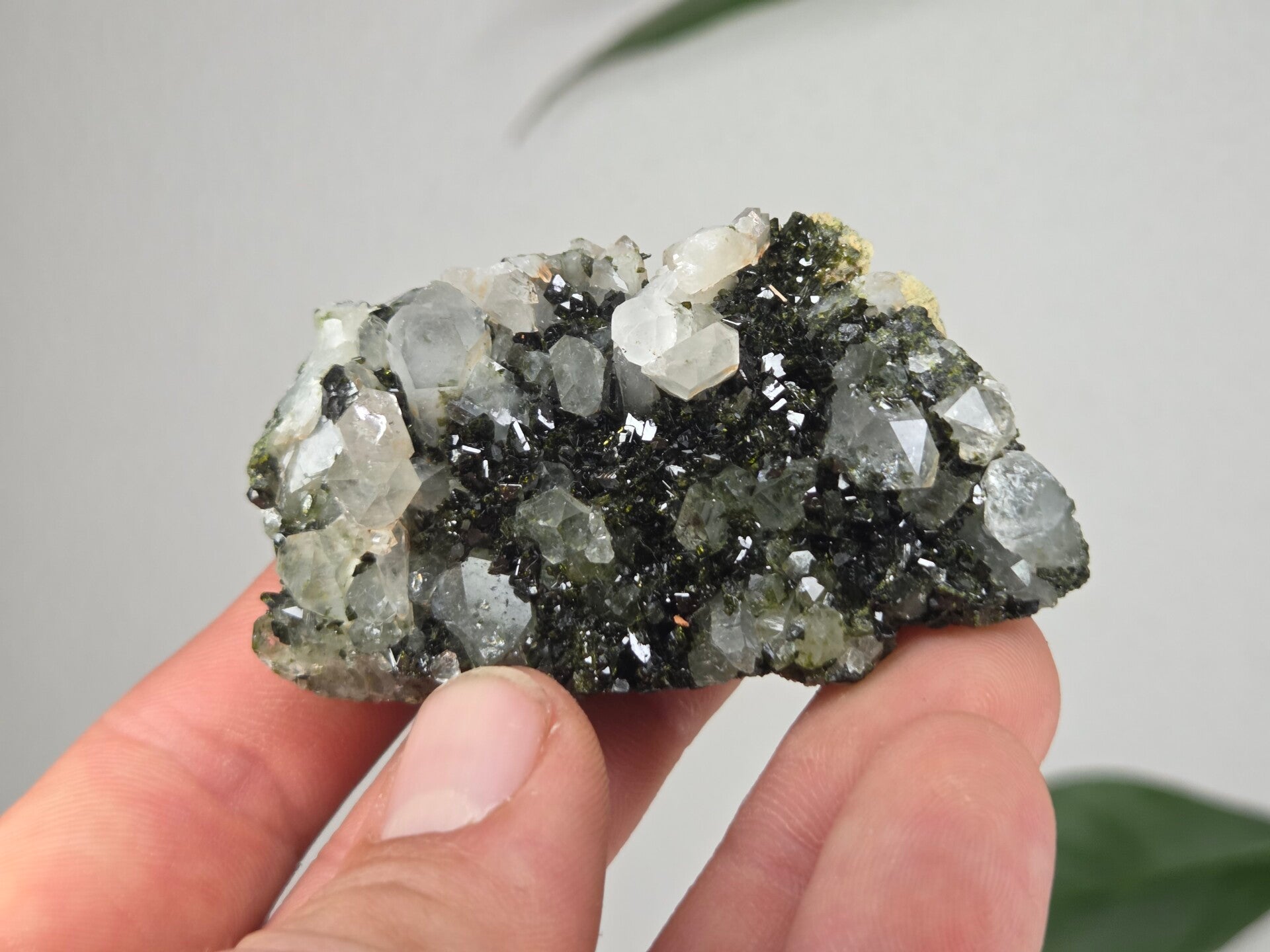 een stuk glanzende epidoot met heldere kwartsen uit semdinli, hakkari gebergte, turkije van 6,7 cm bij 3,8 cm bij 2,5 cm