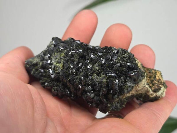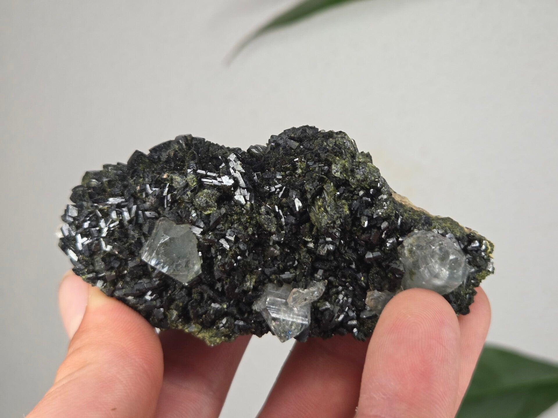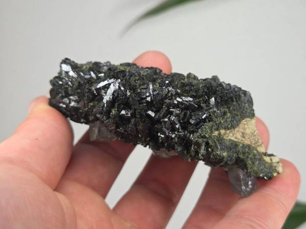 een stuk glanzende epidoot met heldere kwartsen die aan bijde kanten vol zit. uit semdinli, hakkari gebergte, turkije van 8,7 cm bij 4,2 cm bij 3,7 cm