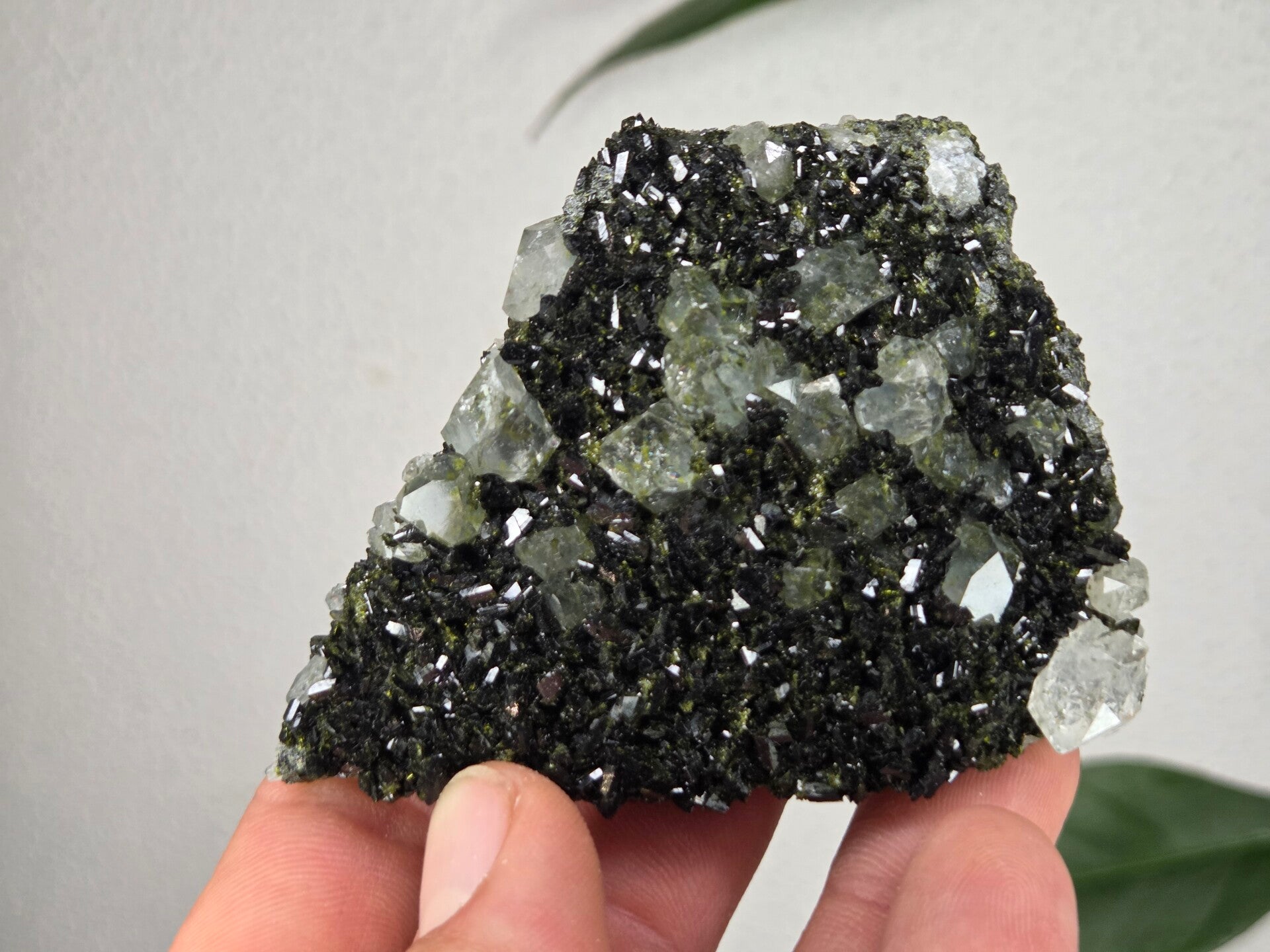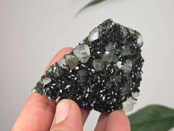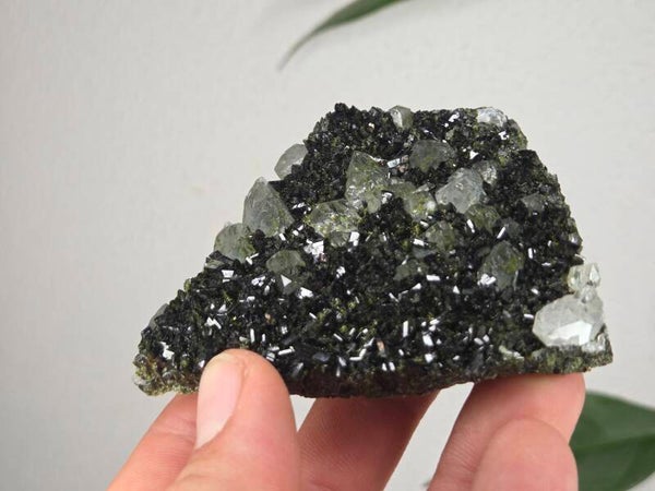 een stuk glanzende epidoot met heldere kwartsen uit semdinli, hakkari gebergte, turkije van 8,2 cm bij 6,5 cm bij 2 cm