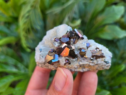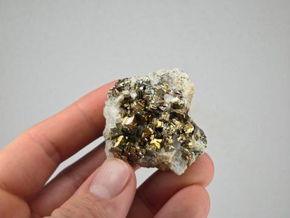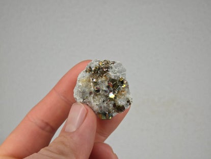 een stukje regenboog pyriet met kwarts uit de kalimantan mijn in borneo, indonesië van 3,2 cm bij 3,2 cm bij 1,7 cm