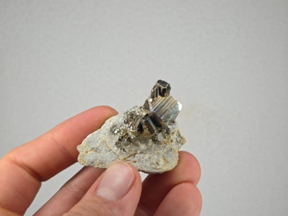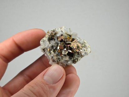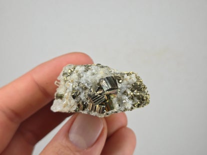 een stukje regenboog pyriet met kwarts uit de kalimantan mijn in borneo, indonesië van 4,4 cm bij 2,4 cm bij 4,2 cm