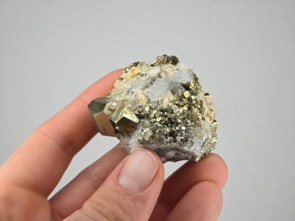 een stukje regenboog pyriet met kwarts uit de kalimantan mijn in borneo, indonesië van 6,5 cm bij 4,1 cm bij 5 cm