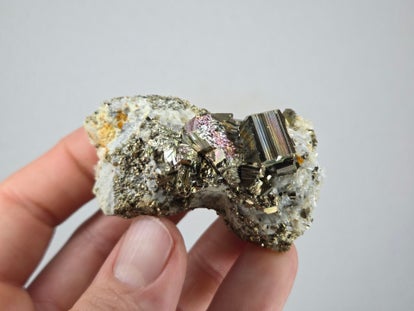 een stukje regenboog pyriet met kwarts uit de kalimantan mijn in borneo, indonesië van 4 cm bij 4,4 cm bij 2,2 cm